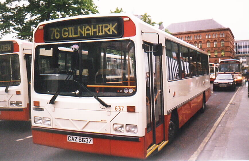 Ulsterbus and Citybus bought 40 'Handybuses' (Dennis Darts with Wright Handybus bodywork) in 1994. About 15 of these, numbered approx. 624 to 640 went into service with Citybus, where at night time and weekends they are often used on main routes, and during the day on less heavily frequented routes. Examples I can think of are the 80 and 81 Grosvenor Road routes and 64 Downview, which are normally operated by Handybuses during the day. The photograph below shows 637 (CAZ 6637) displaying the Gilnahirk destination, which I think is quite unusual.
