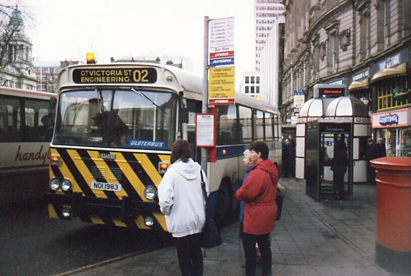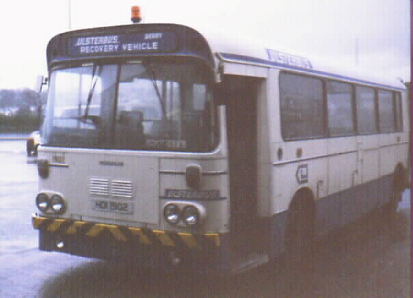 The numbers of Leopard buses now are falling, although they have hardly depleted at all for a few years and lots of buses are approaching 20 years old. Ulsterbus fares recently (March 1998) went up by the biggest amount I can ever remember, so maybe all the extra money's going to be used to buy new buses. The oldest buses in service are from 1978 (I think there is still one Bristol RE [which I will come to later] from 1977 in service in Newtownabbey), but that doesn't include tow buses. Several much older buses are still in service as these, including 1902 (HOI 1902) from 1975 in Derry, shown below.